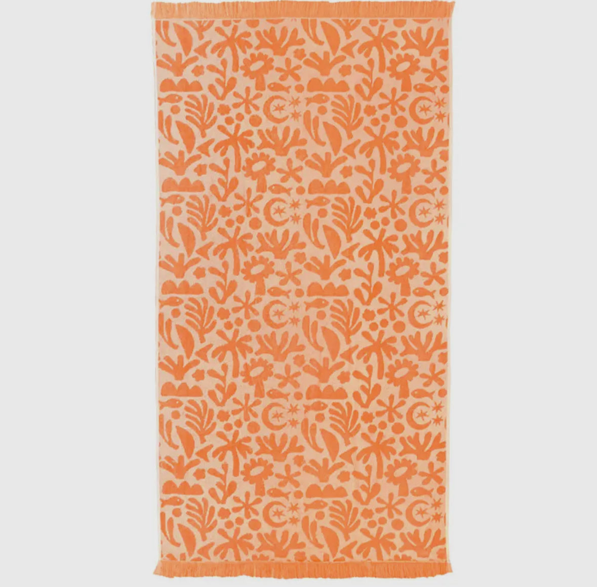 This cotton beach towel is an ideal accessory for the beach or pool. It is made using a high-low pile technique, as well as a playful natural fringing along both ends. The towel is large in size, but lightweight, which makes it compact for travel and quick to dry. This design is a collection of fun holiday elements, and it features a summery colour on a white background.
